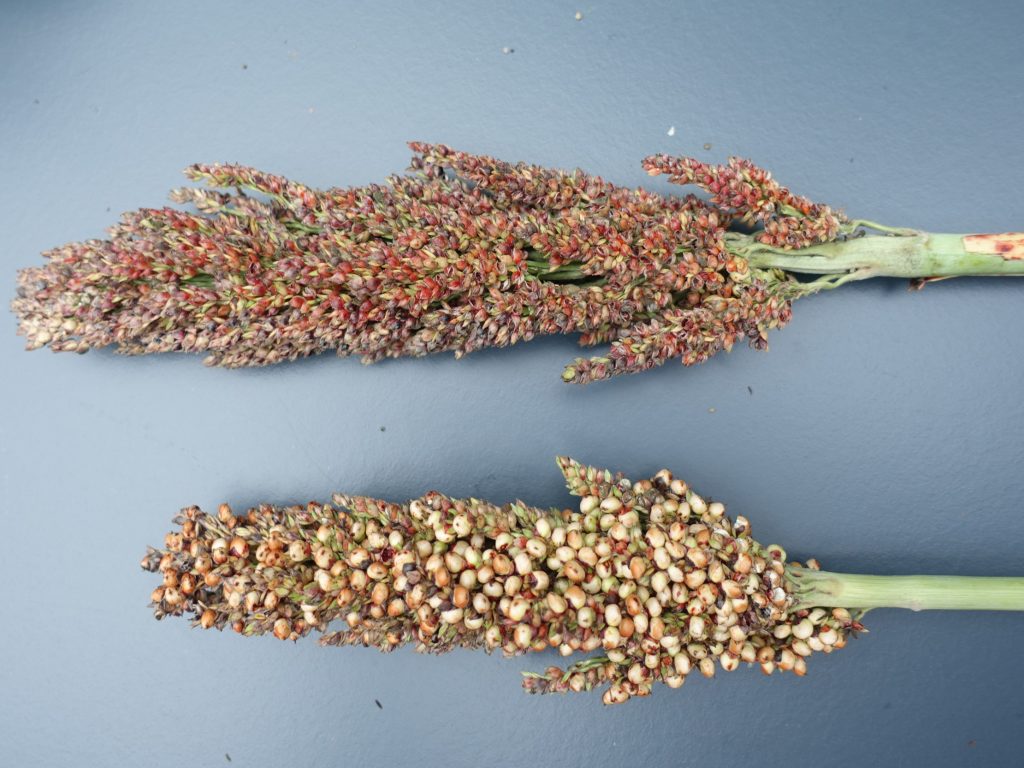 We hebben ook enkele bloeiwijzen afgeknipt om het aantal en het gewicht van de graankorreltjes te meten. De korreltjes zitten erg vast aan de pluim en vallen er niet eenvoudig af. Het gemiddelde gewicht van 100 zaadjes was zo’n 3,8 gram. Gemiddeld zitten er zo’n 1000 zaadjes in een pluim. Er zijn echter ook veel pluimen die slecht met graankorreltjes bezet zijn. In het veld is dat goed waarneembaar: die pluimen kleuren donkerbruin en zijn dunner dan de goed gevulde pluimen. Op onderstaande foto zie je twee graanpluimen van Sorghum; boven: weinig graankorreltjes in de pluim, onder: ruim gevulde pluim met graankorreltjes.